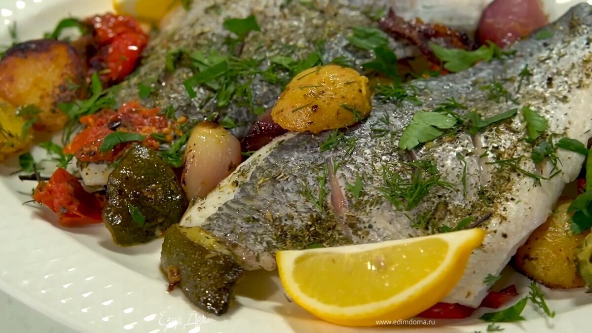 Петрушку и укроп порезать, посыпать рыбу с овощами и подавать с нарезанным дольками лимоном.