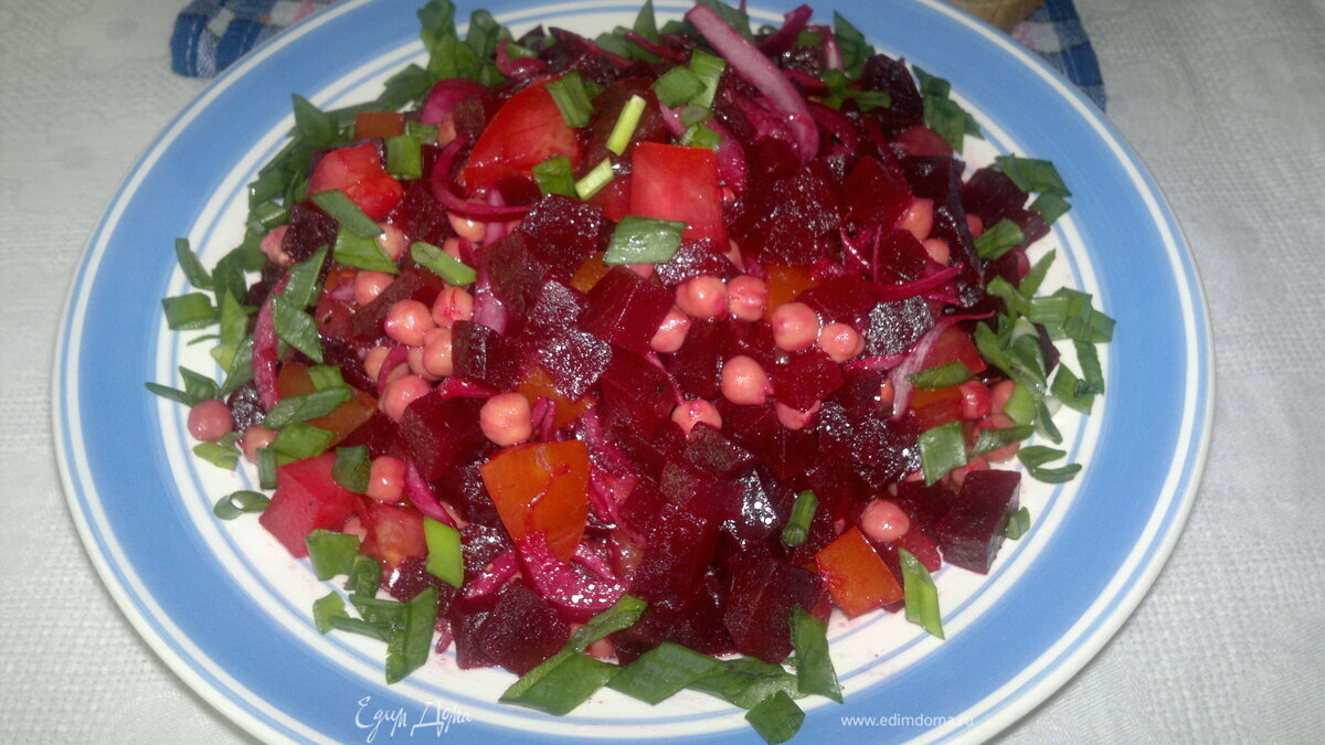 Люблю придумывать новые салаты. Предлагаю вашему вниманию свой рецепт. В нем сочетаются вареная свекла, хрустящий маринованный лук, сочный свежий помидор, питательный консервированный нут.