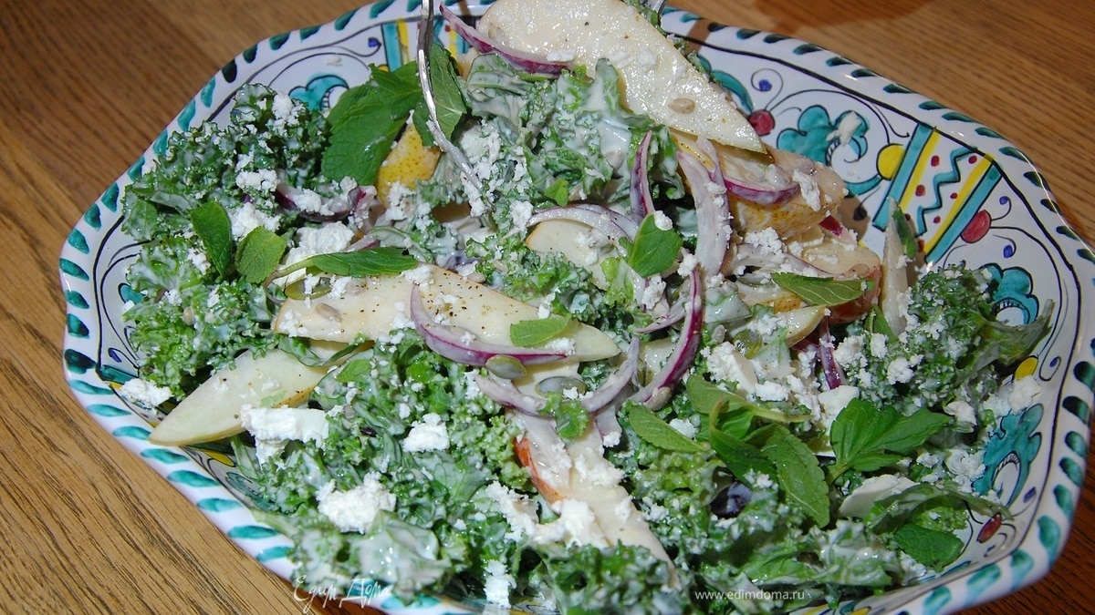 Листья кейла, или кале, как еще называют эту капусту, у меня молоденькие, но, если вам попались с жесткими перепонками, их нужно удалять. А вообще кейл хорошо измельчать в блендере и добавлять в овощные супы или в соусы для макарон и риса. Мне кажется, что яркая, соленая фета выводит этот салат на совершенно другой уровень, а вот лук лучше обдать кипятком, чтобы не перетягивал внимание на себя.