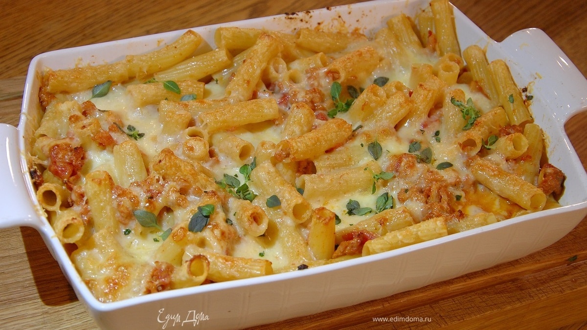Добавить в сковороду макароны, все перемешать и переложить в жаропрочную керамическую форму, сверху разложить порванную руками моцареллу. - Шаг 7