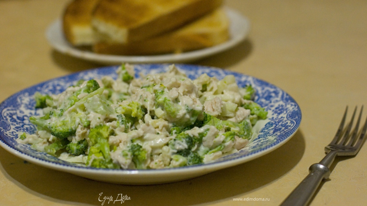 - Шаг 11.Брокколи отварить и разделить на соцветия . 2.Курицу отварить и нарезать . 3.Яблоко очистить и нарезать ломтиками. 4.Все смешать , заправить майонезом и добавить соль.