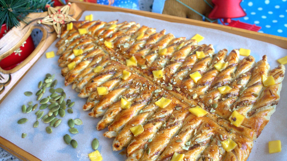 Я опять к вам с «елочкой», на этот раз несладкий вариант. В морозилке всегда держу слоеное тесто вот для таких пирогов-закусочек. Для быстрого варианта можно накрутить просто палочки-спиральки для семейного чаепития.