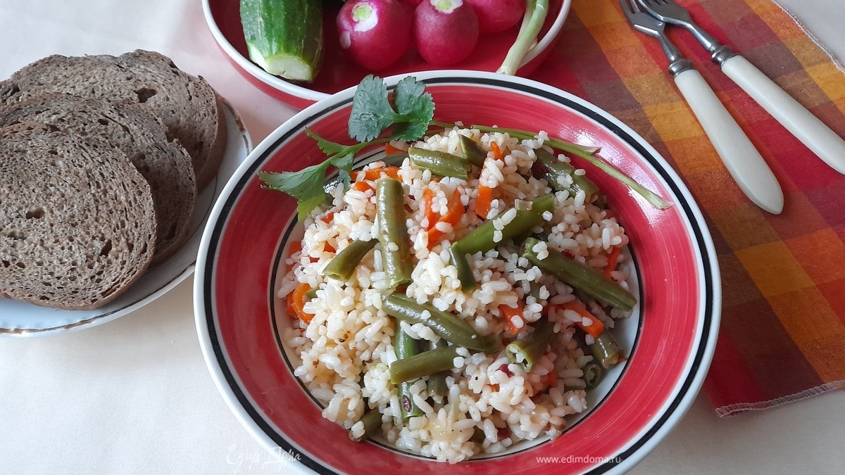 Ароматный рис со стручковой фасолью и другими овощами вкусен и в теплом, и в холодном виде. Можно подать как самостоятельное блюдо или на гарнир. Подойдет для постного стола.