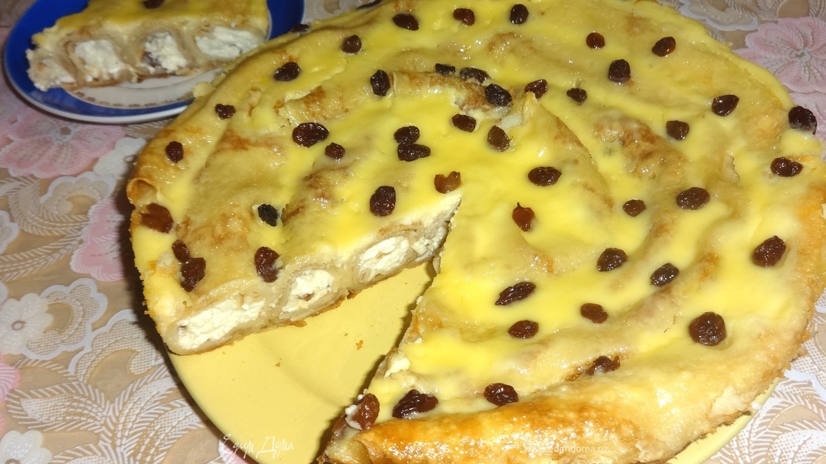 Продолжаем праздновать Масленицу. Сегодня я испекла блинчики, начинила их творогом с изюмом. Уложила фаршированные блинчики в форму по спирали, залила сметанной смесью и запекла. Получилось вкусное блюдо для завтрака, полдника или ужина.