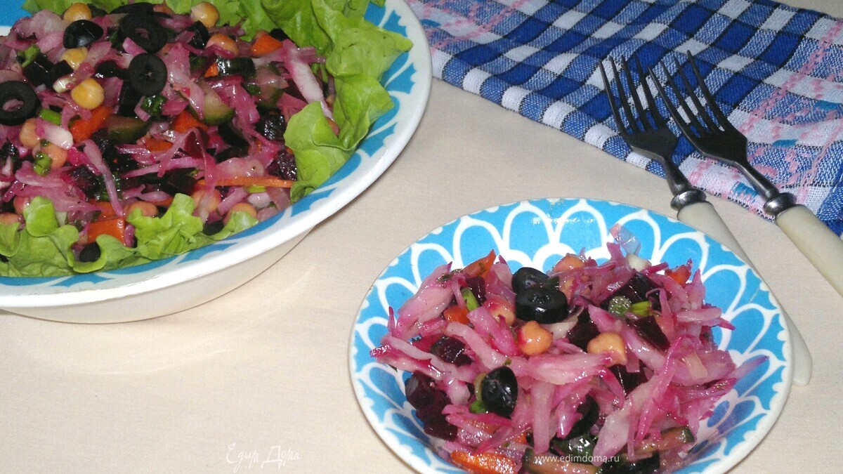 В миске соединить все подготовленные продукты: нут, свеклу, морковь, малосольные огурцы, лук, оливки, капусту. Овощи перемешать, по вкусу подсолить (если нужно), поперчить. Заправить ароматным подсолнечным маслом, еще раз перемешать. - Шаг 10