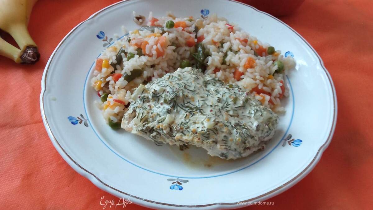 Достаем курицу из духовки и покрываем соусом. Ставим в духовку еще на 15–20 минут. Подаем с любимым гарниром. У меня был рис с овощами. Приятного аппетита!