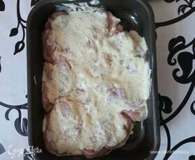 Промытые и обсушенные бумажным полотенцем бедра обмазываем соусом. Выкладываем в чуть-чуть смазанную растительным маслом форму. Ставим в разогретую до 200°C духовку на 30 минут.
