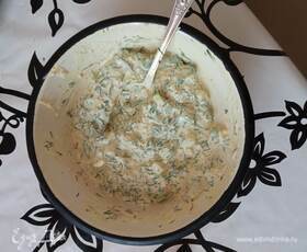 Делаем второй соус. Мелко режем стебель сельдерея и укроп. Смешиваем 2 ст. л. сметаны и 2 ст. л. горчицы. Добавляем в сельдерей с укропом. Солим по вкусу.