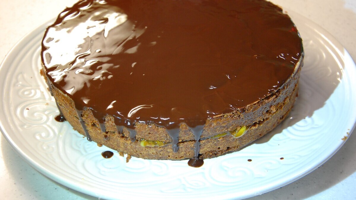 Срезанную сторону коржей часто наколоть зубочисткой и с помощью кисточки пропитать виски, нижний корж смазать апельсиновым джемом, накрыть другим коржом корочкой вверх и полить шоколадной глазурью.