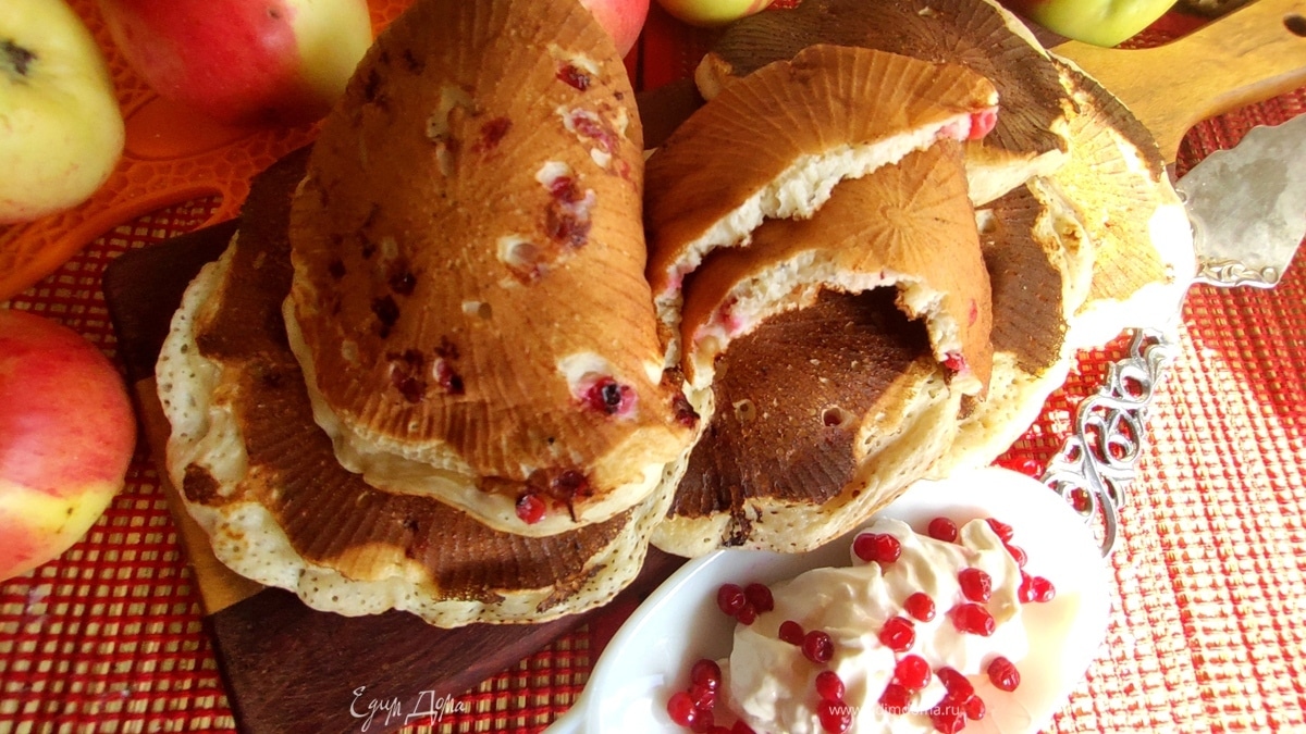 Мягкие, пористые панкейки с кислинкой брусники. Жарим без масла на сухой сковороде. Диаметр — 12–13 см.