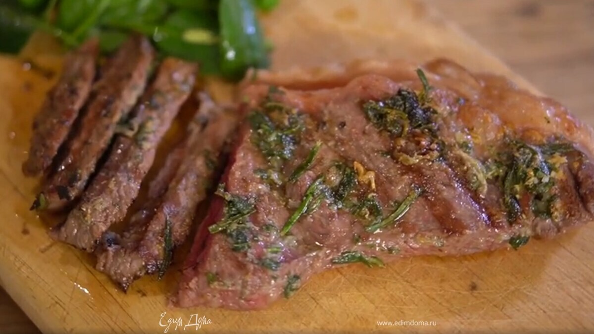 Стейк посыпать крупной морской солью, намазать со всех сторон зеленым маслом и пожарить на разогретом гриле, затем выложить на прогретую тарелку или деревянную доску и дать отдохнуть несколько минут. - Шаг 4