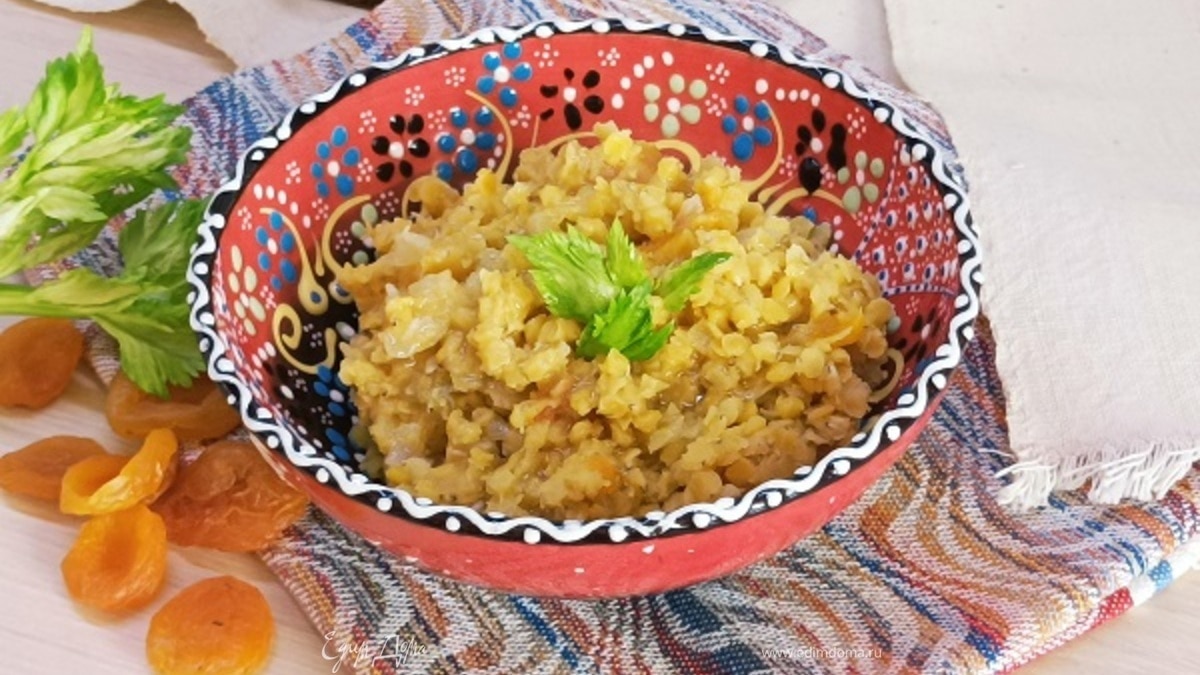 Чечевицу промыть и залить горячей водой (в два раза больше чечевицы). Сюда же добавить промытую и нарезанную кубиками курагу. Варить при медленном кипении до готовности чечевицы и выпаривания всей воды. - Шаг 2