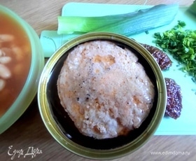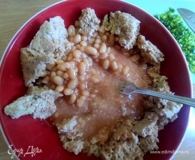 Слить из банок жидкость, соединить рыбу и фасоль. Рассол от фасоли можно добавить в суп.