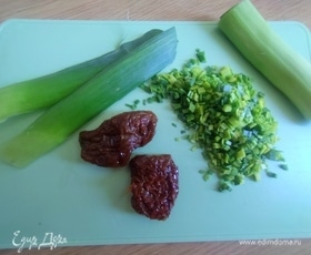 Лук-порей или зеленый лук нарезать.
