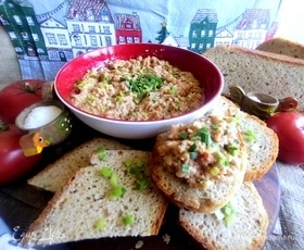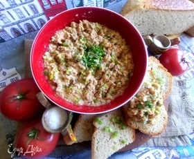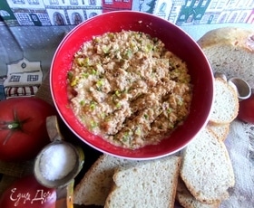Быстрый перекус из двух баночек. Лук и вяленые томаты добавят пикантности. Можно добавить и чеснок, тогда для завтрака не подойдет.