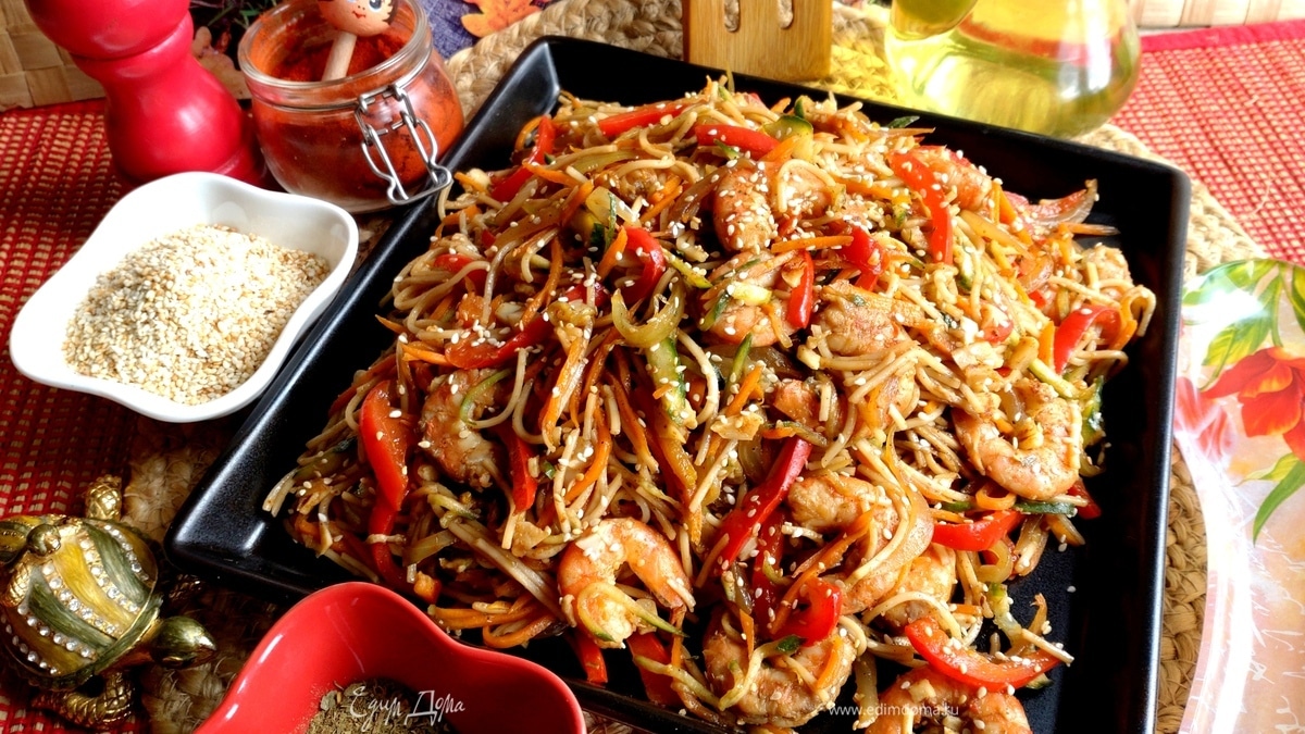 Вместо креветок можно использовать куриную грудку, нарезав ее соломкой и обжарив в воке.