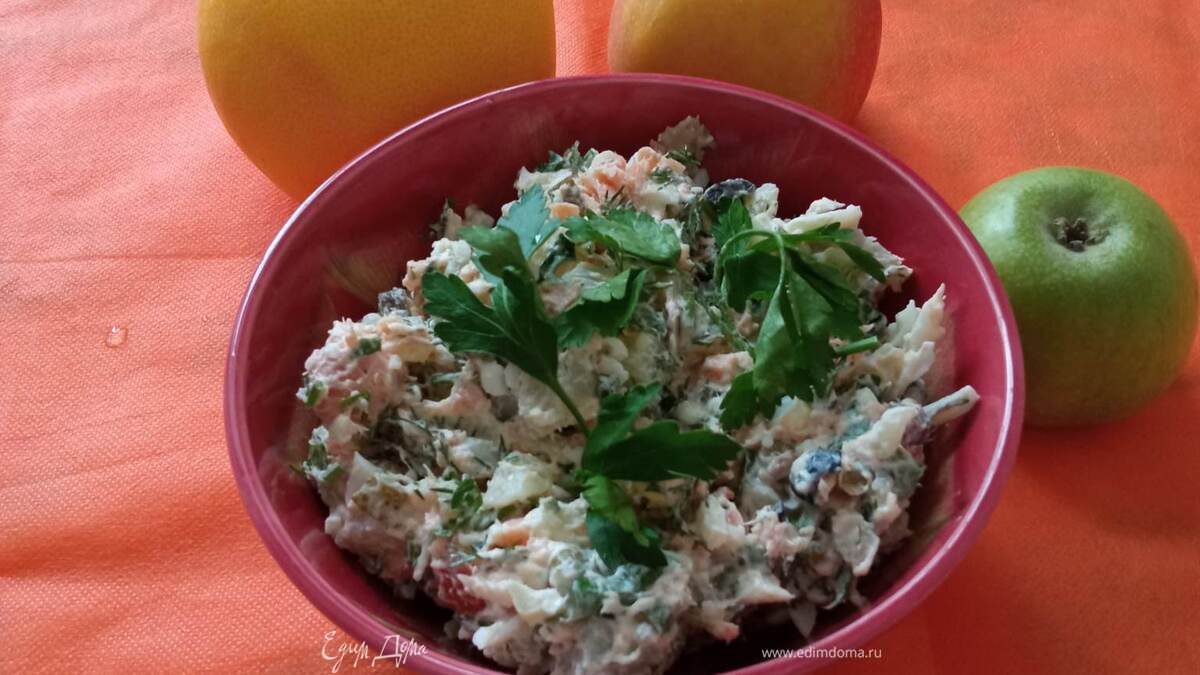 Мелко режем петрушку и укроп. Добавляем в салат. Все перемешиваем, перчим по вкусу. Если надо, солим. Я не солю салаты с майонезом. Заправляем майонезом. - Шаг 3