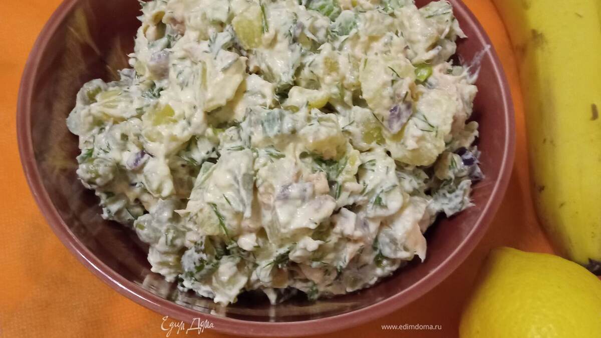 Салат по мотивам салата Василия Емельяненко, который создал его по мотивам немецкого картофельного салата. Вот такая длинная цепочка получилась. У меня горбуша горячего копчения, но можно взять любую копченую рыбу. У В. Емельяненко рыба была белая.
