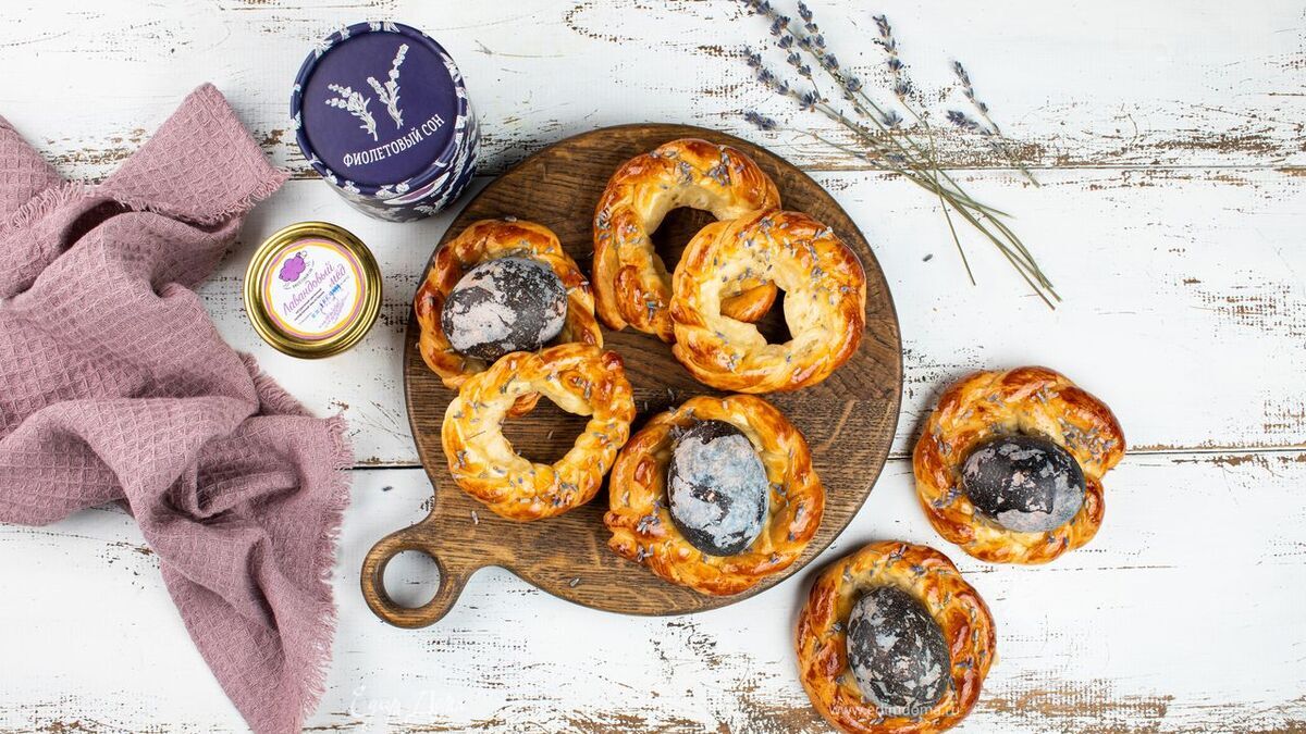 Смажьте веночки взбитым желтком, выпекайте 20 минут в духовке, разогретой до 180–190°C. Полейте сиропом веночки и украсьте их лавандой «Фиолетовый сон». - Шаг 9