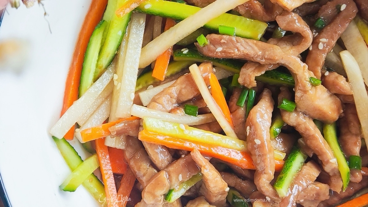 - Шаг 2На раскаленной сковороде обжариваем мясо до готовности. Нарезаем огурец, морковь и дайкон тонкой стружкой. Добавляем к мясу, заправляем одной ложкой растительного масла, соевым соусом и лимонным соком. Добавляем зеленый лук и кунжут.