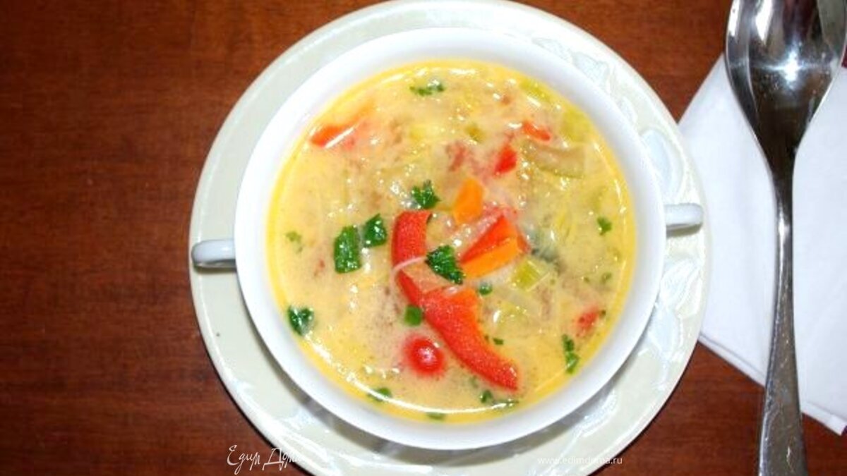 Острый тайский суп с кокосовым молоком и овощами.