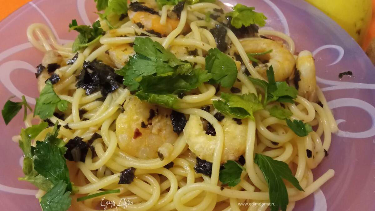 В сковороду выкладываем спагетти и креветки. Перемешиваем. Прогреваем в соусе пару минут. - Шаг 4