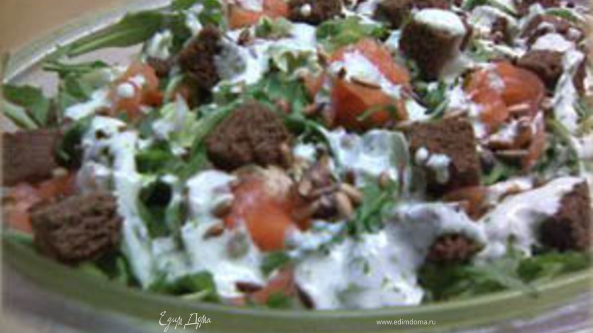 - Шаг 3На тарелку уложить руколу, сверху кусочки рыбы, сухарики, посыпать семечками и щедро полить сметанно - луковым соусом.