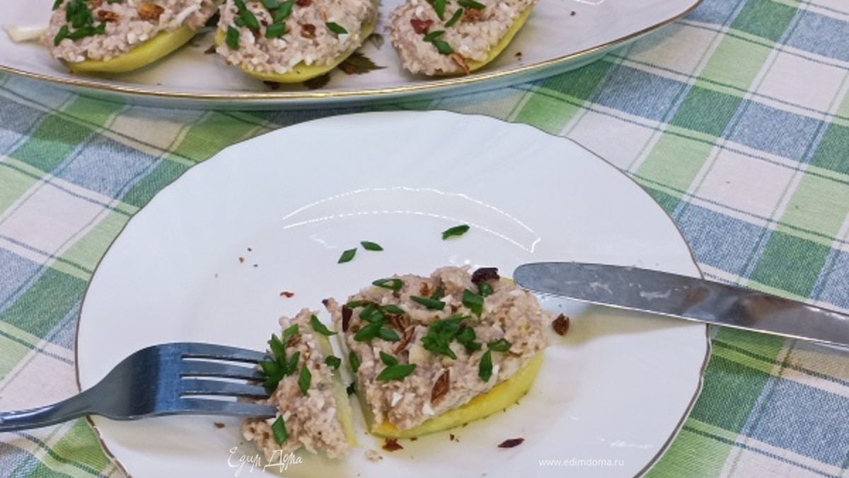 - Шаг 1Яйца отварить вкрутую и очистить. Кусочки белого батона замочить в воде. Лук нашинковать полукольцами и залить лимонным соком, слегка перетереть руками. Яблоко очистить от кожицы и семян, нарезать кубиками. Орехи подсушить на сухой сковороде и очистить, насколько это возможно, от кожицы. Филе сельди нарезать на средние кусочки.