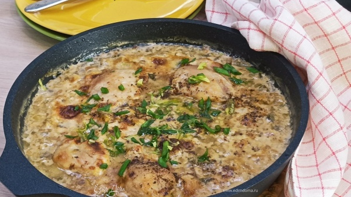 В сливки добавляем немного жидкости со сковороды, перемешиваем и выливаем к курице. Доводим до кипения, пробуем на соль, перчим и помещаем в духовку, разогретую до 180°C. Запекаем 25–30 минут.