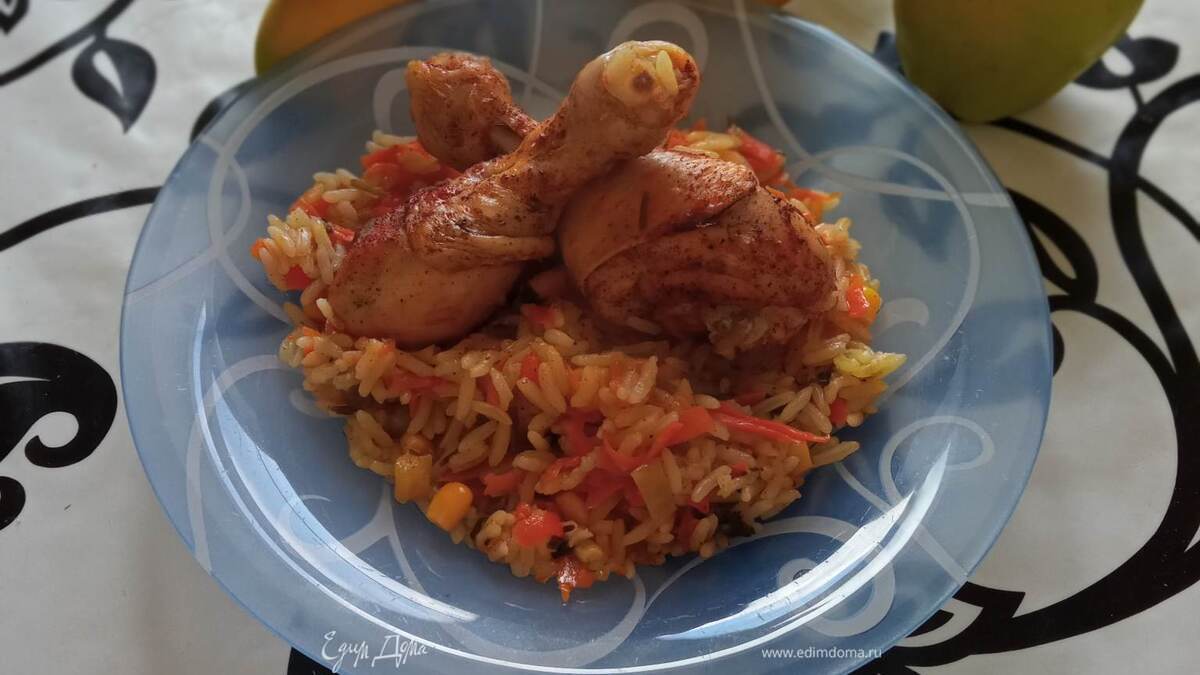 Переложить смесь в форму. Залить двумя стаканами кипятка или горячим бульоном. Курицу натереть со всех сторон солью, перцем и паприкой. Выложить на рис. Накрыть фольгой и поставить в духовку. - Шаг 3
