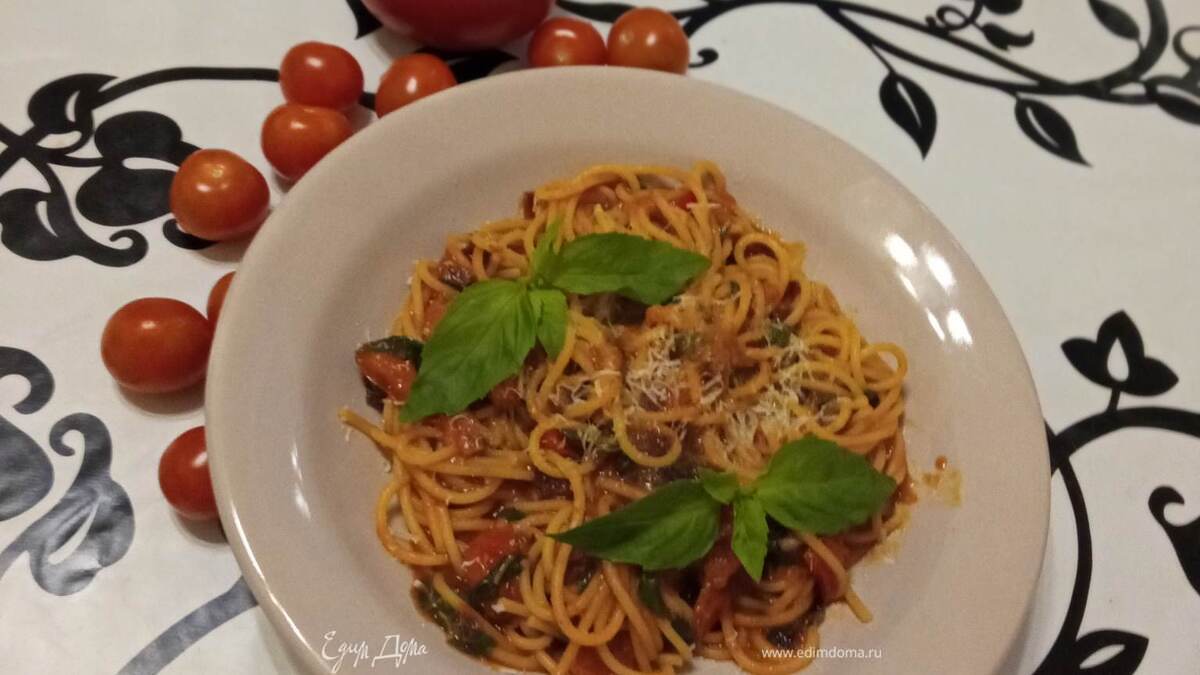 Когда спагетти готовы, сливаем, промываем холодной водой и отправляем в сковороду с соусом. Все хорошенько перемешиваем и прогреваем минут 5. Извините, забыла сфотографировать этот момент, но там все просто. Подаем ароматные спагетти, посыпав тертым пармезаном и украсив базиликом. Приятного аппетита!