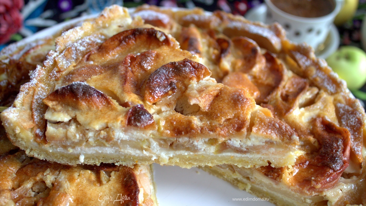 Хрустящий корж с обилием начинки в нежной заливке — пирог, напоминающий пирожное. Не хватает шарика мороженого — и полноценный десерт готов. Хорошо готовить в период урожая яблок.