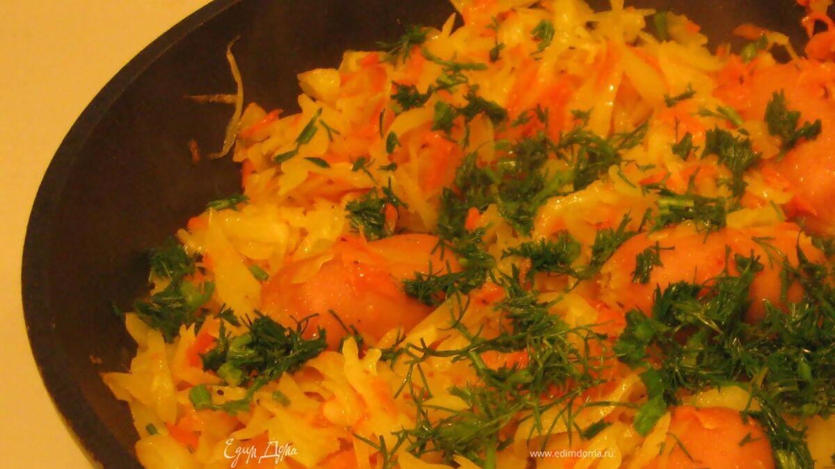 Почему-то тушеную капусту с сосисками принято готовить долго. Я предлагаю приготовить ее на сковороде на сильном огне всего за 20 минут. Она получается очень сочной и вкусной.