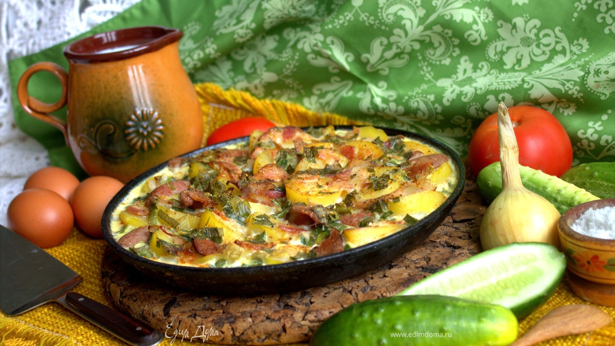 Летом у латышского фермера много дел, и нужен сытный завтрак, чтобы потом не отвлекаться на еду. Как говорят: летом день год кормит. Колбасы, шпек и яйца использовали домашние, я взяла популярные охотничьи колбаски и готовила в раритетной чугунной сковороде.