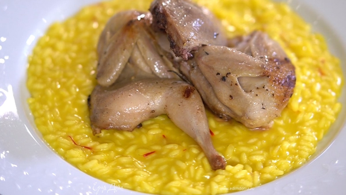 Готовых перепелок разрезать и подавать вместе с ризотто.