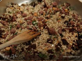 Приготовить тостатуру: рис всыпать в сковороду с луком и, помешивая, прокалить его, влить 100 мл вина и дать алкоголю выпариться, затем по одному половнику вливать горячий бульон. - Шаг 4