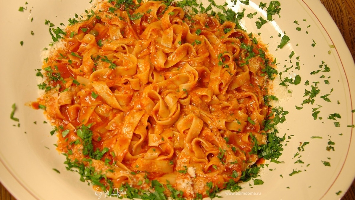 Феттучине в томатном соусе с оливками, анчоусами и каперсами