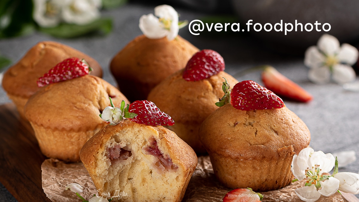 - Шаг 3В силиконовую форму выложить немного теста, добавить нарезанную на небольшие кусочки клубнику, сверху положить еще тесто. Форма должна быть заполнена на 2/3, т. к. в процессе выпекания тесто поднимется. Выпекать 30–35 минут при 180°C.