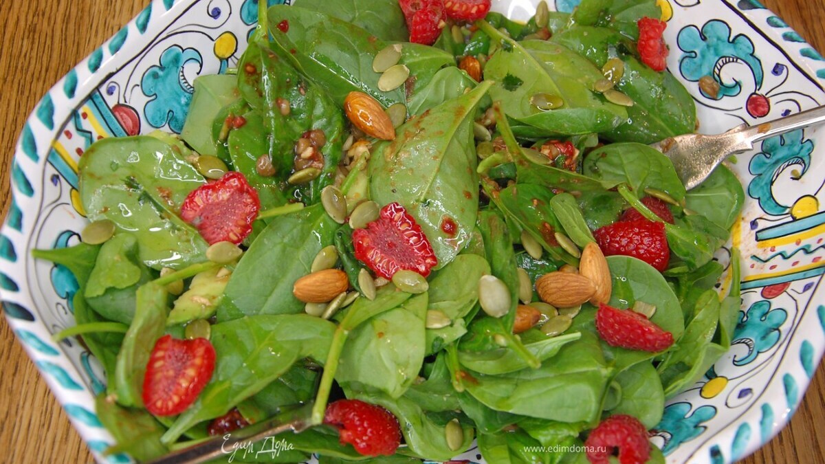 Вместо шпината подойдет рукола или любой листовой салат, какой вам нравится, главное, чтобы листья были свежие и хрустящие. Можно добавить грецкие или кедровые орехи, а тыквенные семечки заменить подсолнечными или кунжутом.