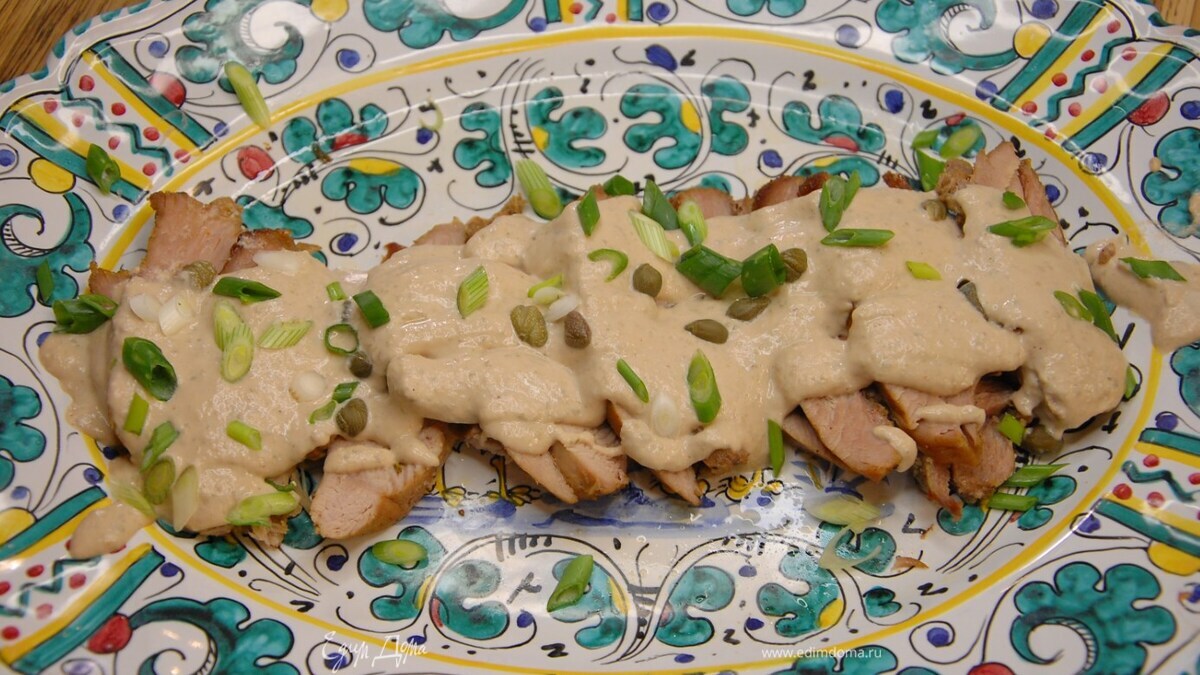 Готовую индейку охладить, нарезать тонкими ломтиками, полить соусом, посыпать нарезанным луком и оставшимися каперсами.