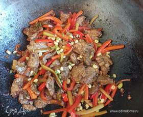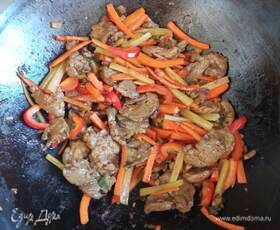 Добавляем свинину, перемешиваем и жарим 5 минут. Затем кидаем морковь, перец и оставшийся сельдерей. Помешиваем, готовим 5 минут.