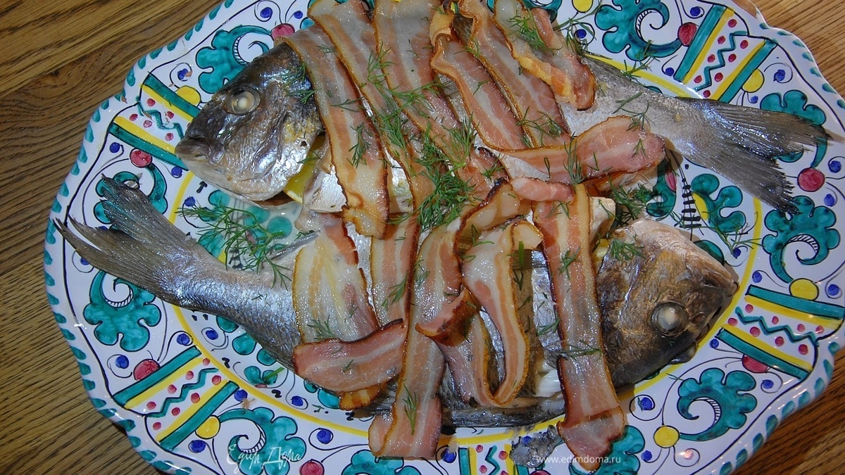 Дорада, запеченная с беконом, чесноком и тимьяном