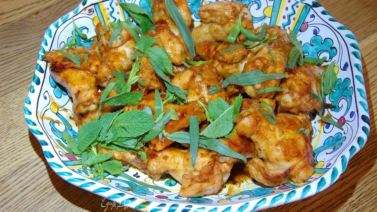 Готовые крылья переложить на тарелку, полить оставшимся в противне соусом и украсить листьями тархуна и мяты.