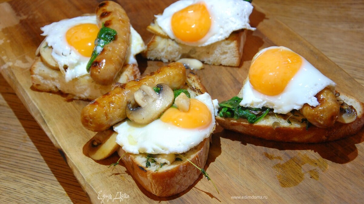 На обжаренный хлеб выложить грибы с чесноком, шпинат, колбаски и поджаренные яйца.
