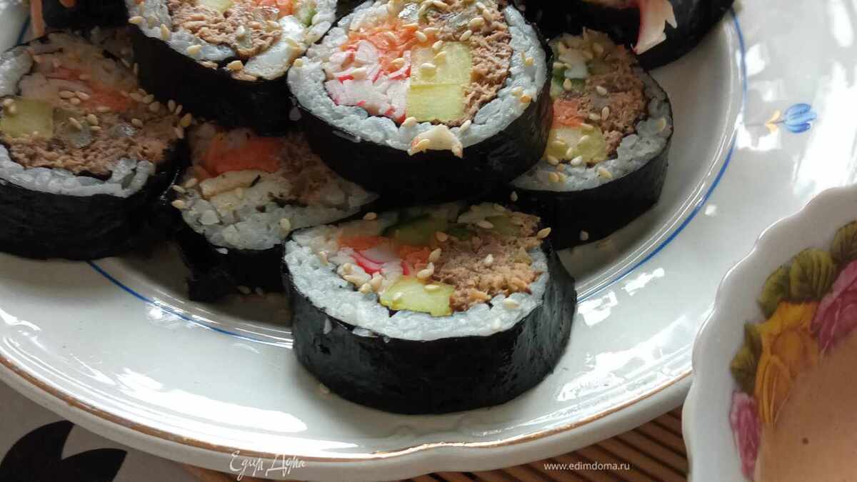 Сегодня готовим кимпаб с тунцом. Практически классический вариант. Я делала 2 кимпаба. Нам с дочкой хватает по одному. Для мужчин можно сделать два на порцию. Беда в том, что везде даются пропорции на 10 и более кимпабов, но они не хранятся долго, всего несколько часов. Потом нори отсыревает. Поэтому ингредиенты у меня почти на глаз. Например, нужно, чтобы яичный блинчик был толстеньким, поэтому приходится брать два яйца, но остается часть блинчика. Поэтому, если вы делаете, например, 4 кимпаба, вам не нужно больше яиц для блинчика. Если у меня остаются ингредиенты, я делаю «ленивый кимпаб». То есть беру все эти же (оставшиеся) ингредиенты и кладу их на чипсы нори. Тунец берем в собственном соку, не в масле. Под 2 шт. дайкона в ингредиентах я подразумеваю 2 брусочка в размер листов нори. То есть по 1 на кимпаб. Если бруски короче, берем 2 или 1,5.