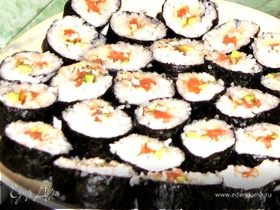 Сверху кладем морковь, крабовые палочки и огурец. С помощью циновки аккуратно, но плотно сворачиваем рулет. Верхний край нори можно чуть-чуть смазать водой, чтобы лучше слиплось. - Шаг 5