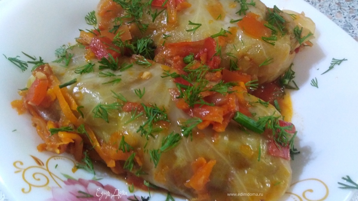 В кастрюлю на дно выложить часть зажарки, затем голубцы. Залить все отваром от капусты. Добавить лавровый лист, досолить при необходимости. - Шаг 9