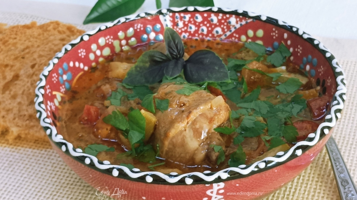 Курицу нарежьте порционными кусками. Кабачки и перец нарезать крупными кубиками. Лук — полукольцами. Чеснок разрезать на несколько долек. Помидоры очистить от кожицы и нарезать кубиками. - Шаг 2