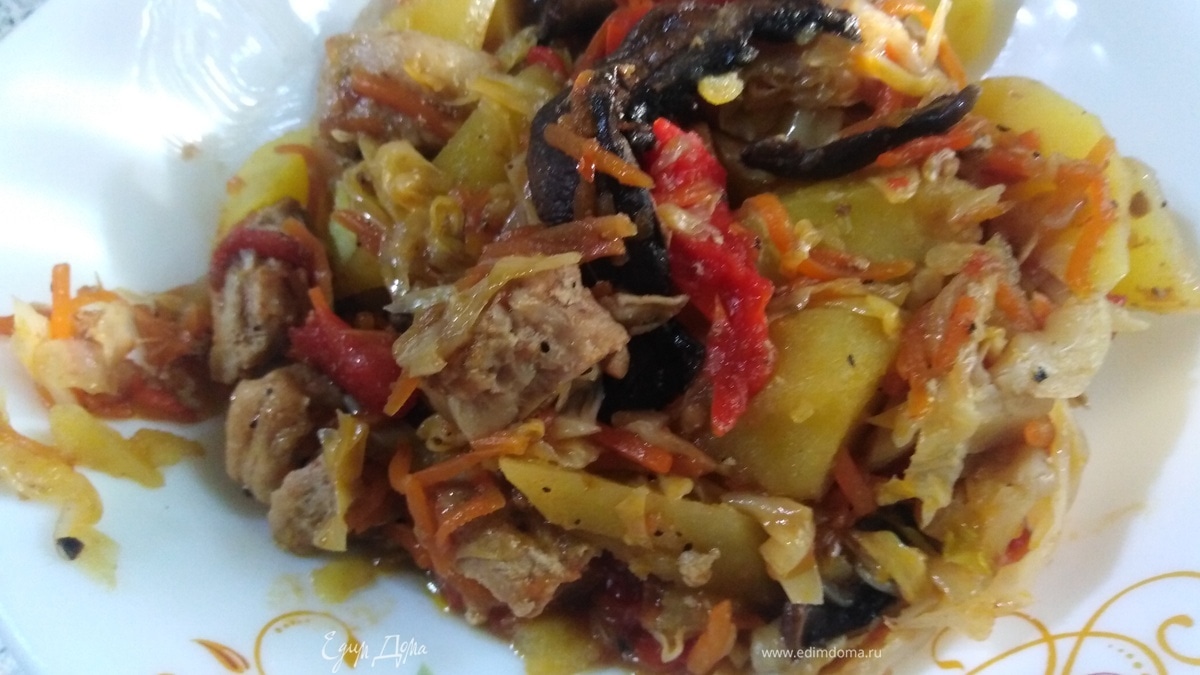 Добавить нарезанный картофель, влить стакан воды, посолить. Накрыть крышкой, тушить 20 минут.