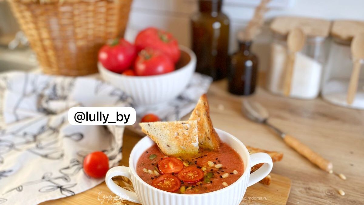- Шаг 7Наш гаспачо готов! Идеально подавать его с гренками, оливками, орешками и оливковым маслом. Можно также разбавить суп водой.